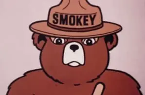 “America the Ugly” shows a forest fire. The camera then zooms out until the fire is revealed to be a reflection in the left eye of a costumed Smokey Bear. Smokey looks at the camera and says, “Only you.”