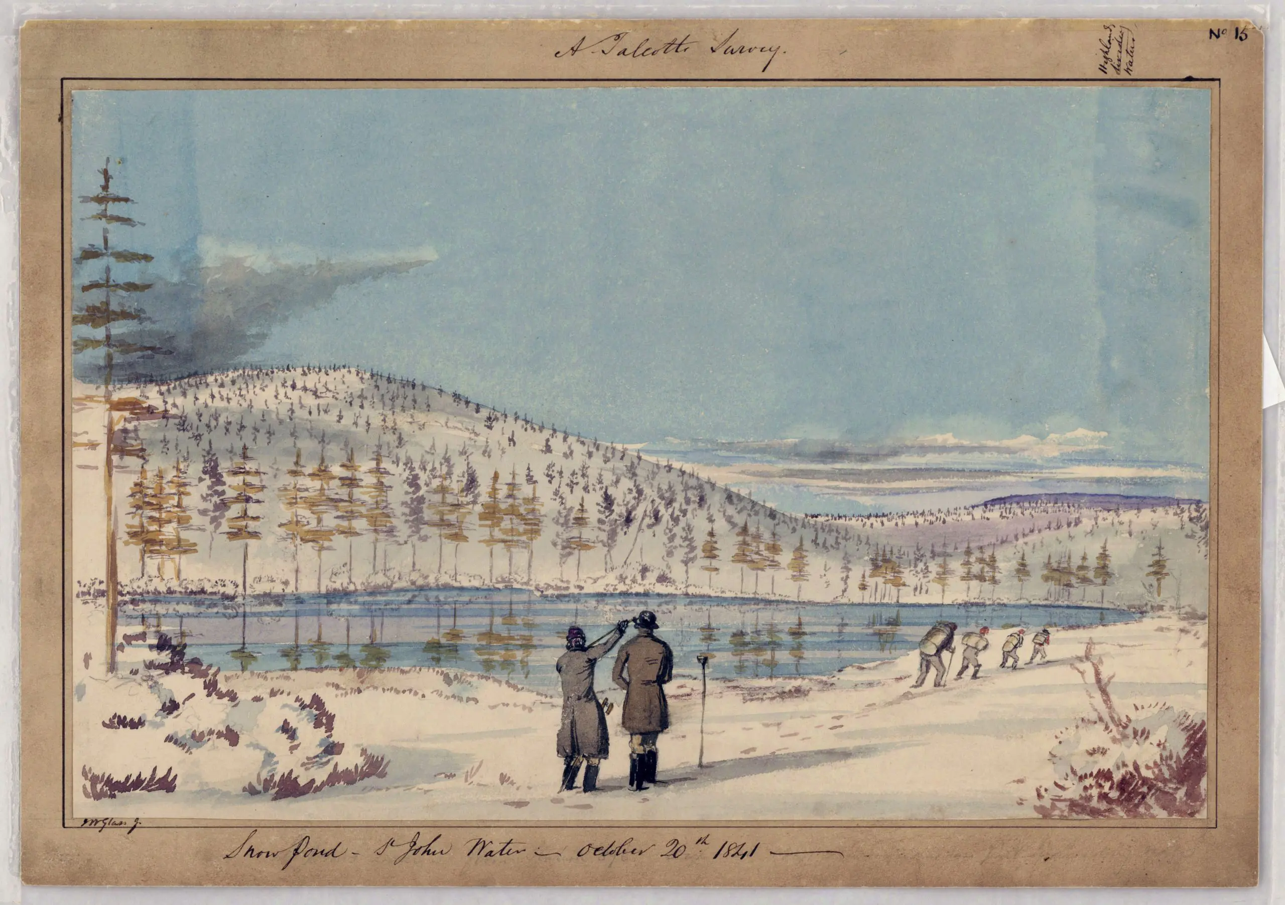 This watercolor Snow Pond – St John Water comes from a series of maps and related records pertaining to the establishment of the boundary between the United States and Canada from Passamaquoddy Bay to the St. Lawrence River. Included in the series are 15 watercolor sketches of the terrain and survey parties at work.