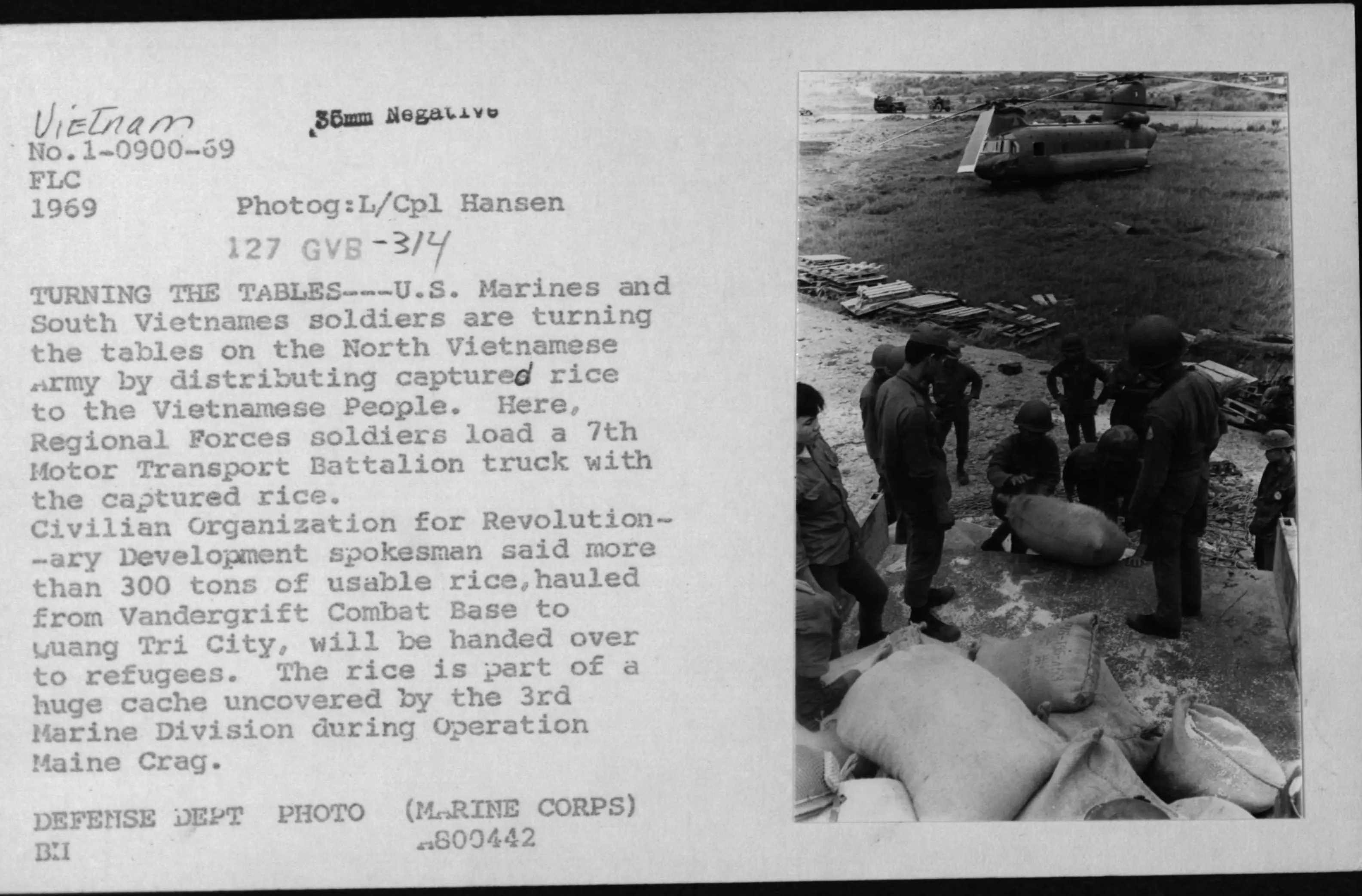The original caption for this photograph reads: U.Turning the Tables—U.S. Marines and South Vietnamese soldiers are turning the tables on the North Vietnamese Army by distributing captured rice to the Vietnamese People. Here, Regional Forces soldiers load a 7th Moto Transport Battalion truck with the captured rice. Civilian Organization for Revolutionary Development spokesman said more than 300 tons of usable rice, hauled from Vandergrift Combat Base to Quang Tri City, will be handed over to refugees. The rice is part of a huge cache uncovered by the 3rd Marine Division during Operation Maine Crag.