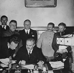 View the full document here: https://docsteach.org/document/soviet-foreign-minister-molotov-signs-the-germansoviet-nonaggression-pact-joachim-von-ribbentrop-and-josef-stalin-stand-behind-him-moscow-august-23-1939-von-ribbentrop-collection/