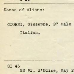 This document shows the interview and findings for the status of Giuseppe Giorni, a 27 year old male immigrant from Italy. The inquiry determined Giorni was to be deported based on his varicose veins and that he would likely become a public charge. It comes from a file about European war, German refugees, deportation of Italians, and alien deportations from 1914–1915.