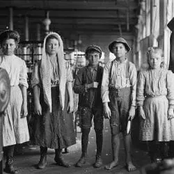 The growth of industry after the Civil War increased the demand for workers and pulled more and more children into the labor force. By 1910, children made up 18.4 percent of the total labor force. The National Child Labor Committee (NCLC), in New York City began investigations with child labor conditions in coal mines, capitalizing on the public concern raised during the nationwide coal miners’ strike of 1902. Later, NCLC investigations centered upon the glassmaking industry, textile mills-especially in the South-and the canning industry. Eyewitness accounts produced at the beginning of the 20th century detailed the kind of working conditions of child laborers that the NCLC was investigating and publicizing. One account, taken from Al Priddy’s Through the Mill (Northwood, Massachusetts, 1911), describes conditions in a cotton mill: The mule-room atmosphere was kept at from eighty-five to ninety degrees of heat. The hardwood floor burned my bare feet. I had to grasp quick, short gasps to get air into my lungs at all. My face seemed swathed in continual fire…. Oil and hot grease dripped down behind the mules, sometimes falling on my scalp or making yellow splotches on my overalls or feet. Under the excessive heat my body was like a soft sponge in the fingers of a giant; perspiration oozed from me until it seemed inevitable that I should melt away at last. To open a window was a great crime, as the cotton fiber was so sensitive to wind that it would spoil…. When the mill was working, the air in the mule-room was filled with a swirling, almost invisible cloud of lint, which settled on floor, machinery, and employees, as snow falls in winter. I breathed it down my nostrils ten and a half hours a day; it worked into my hair, and was gulped down my throat. This lint was laden with dust, dust of every conceivable sort, and not friendly at all to lungs. In 1908 the NCLC hired Lewis W. Hine to investigate and to photograph the conditions of working children.
