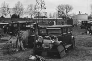 The original caption for this photograph reads: Sacramento, California. Close-up view of squatter camp. This family lives in the car without a tent.