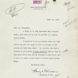 Secretary of War Henry Stimson wrote this letter to President Truman within two weeks of the death of President Franklin Roosevelt and Truman’s swearing-in. Although Stimson does not mention it by name, the Manhattan Project is the highly secret matter he wished to discuss with the President.