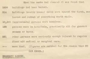 This is a summary compiled for the American Red Cross Headquarters at Washington, DC. It provides a narrative overview of the massacre, the kinds of relief the Red Cross provided, and a list of destruction: