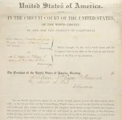 Inventor Jacob W. Davis defending his rights for the use of the copper rivets as fasteners for the edges of pockets on pantaloons, overalls, and coats. Levi Strauss and Jacob W. Davis became business partners in the Levis Strauss Company. These copper rivets on the edges of the pockets become the trademark for the Levi Jeans.