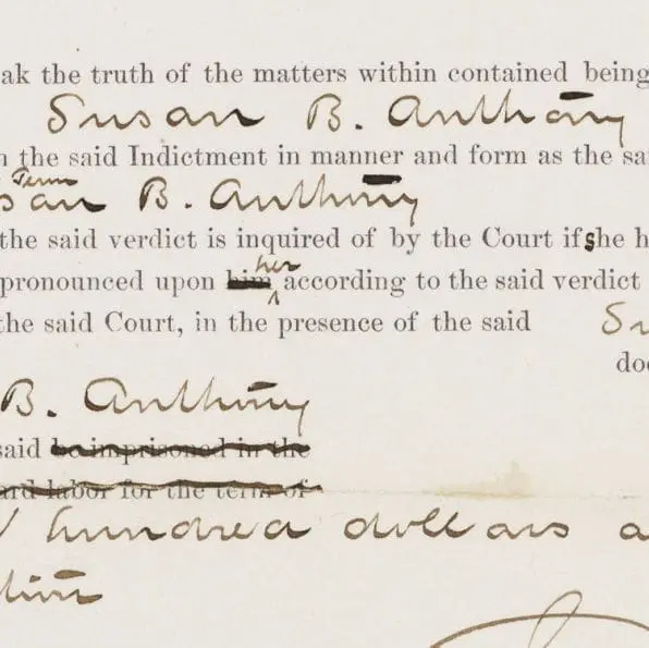 one thousand eight hundred and seventy-three aforesaid come as well the Attorney of the United States for the said District as the said Susan B. Anthony and come also the jurors aforesaid;and the said jurors to speak the truth of the matters within contained being chosen, tried and sworn upon their oaths say, that the said Susan B. Anthony is guilty of the offenses charged in the said Indictment in manner and form as the same are therein set forth. And ^[above there on the 19th] there Court, and having heard the said verdict is inquired of by the Court if she has anything to say why the judgment of the law should not be pronounced upon him ^her according to the said verdict: and no sufficient answer being given, His Honor the Judge of the said Court, in the presence of the said Susan B. Anthony does here adjudge and sentence that the said Susan B. Anthony for the said offenses of which she stands convicted as aforesaid be imprisoned in the at hard labor for the term of years and months and pay a fine of one hundred dollars and the arts