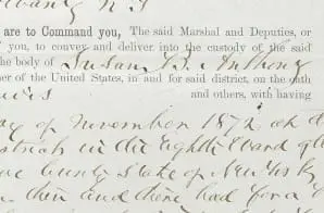 These are to Command you, The said Marshal and Deputies, or either of you, to convey and deliver into the custody of the said keeper, the body of [handwritten] Susan B. Anthony [continue printed text]