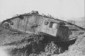The original caption for this photograph reads: A tank going over a trench on its way into action. It comes from a series of photographs depicting military activities during World War I that were taken by British photographers and acquired by the U.S. War Department.
