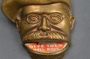 This Republican campaign pin shows Theodore Roosevelt from his Spanish-American War days. It is the shape of Teddy Roosevelt’s head, wearing a hat with the proper left side of the brim turned up. It says “U.S.V.” in small raised letters on the collar underneath Roosevelt’s chin. When the chin and collar are pulled down, Roosevelt’s mouth opens to reveal a red paper label with white text: “Give Them Hell Boys.”