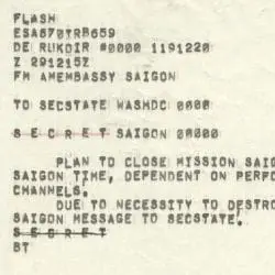 The American Embassy in Saigon sent this telegram to Secretary of State Henry Kissinger with the planned time to close Mission Saigon. It reads “Due to necessity to destroy commd gear, this is the last Saigon message to SecState.”