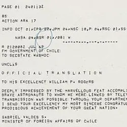 Full Citation: Telegram from Foreign Minister Gabriel S. Valdes of Chile to Secretary of State William P. Rogers; 7/21/1969; General Records of the Department of State, Record Group 59. [Online Version, https://docsteach.org/document/telegram-from-foreign-minister-gabriel-s-valdes-of-chile-to-secretary-of-state-william-p-rogers/, December 19, 2025]
