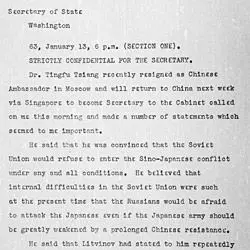 Full Citation: Telegram from Ambassador William C. Bullitt Regarding the Sino-Japanese War; 1/13/1938; Records Relating to the Investigation of Alger Hiss, 1948–1951; General Records of the Department of Justice, Record Group 60; National Archives at College Park, College Park, MD. [Online Version, https://docsteach.org/document/telegram-sino-japanese-war-pumpkin-papers/, March 10, 2026]