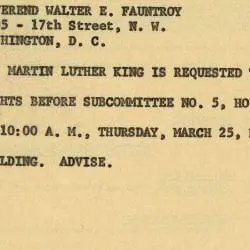 Full Citation: Telegram to Martin Luther King, Jr., Requesting Testimony before House Judiciary Committee on Voting Rights Act of 1965; 3/18/1965; Records from the U.S. House of Representatives,. [Online Version, https://docsteach.org/document/telegram-to-martin-luther-king-jr-requesting-testimony-before-house-judiciary-committee-on-voting-rights-act-of-1965/, December 17, 2025]