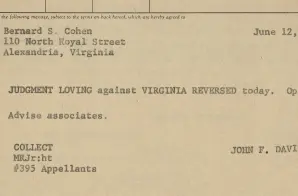This telegram was sent to the Lovings’ attorney, Bernard Cohen, announcing that the judgement against them was reversed. The Lovings returned to Virginia following the ruling.