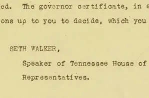 Seth Walker, Speaker of the Tennessee House of Representatives, sent this telegram to Secretary of State Bainbridge Colby informing him that the Tennessee Legislature could not act on 19th Amendment and that the amendment had not been ratified.