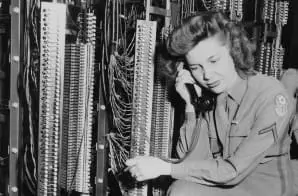 The original caption for this photograph reads: PFC Gladys Bellon, Basile, Louisiana, one of the 27 WAC switchboard operators flown from Paris for the Potsdam Conference and Sgt. Robert Scott of Pittsburgh, Pennsylvania, test lines in the frame room of the Victory switchboard at U. S. headquarters at Babelsburg, Germany.