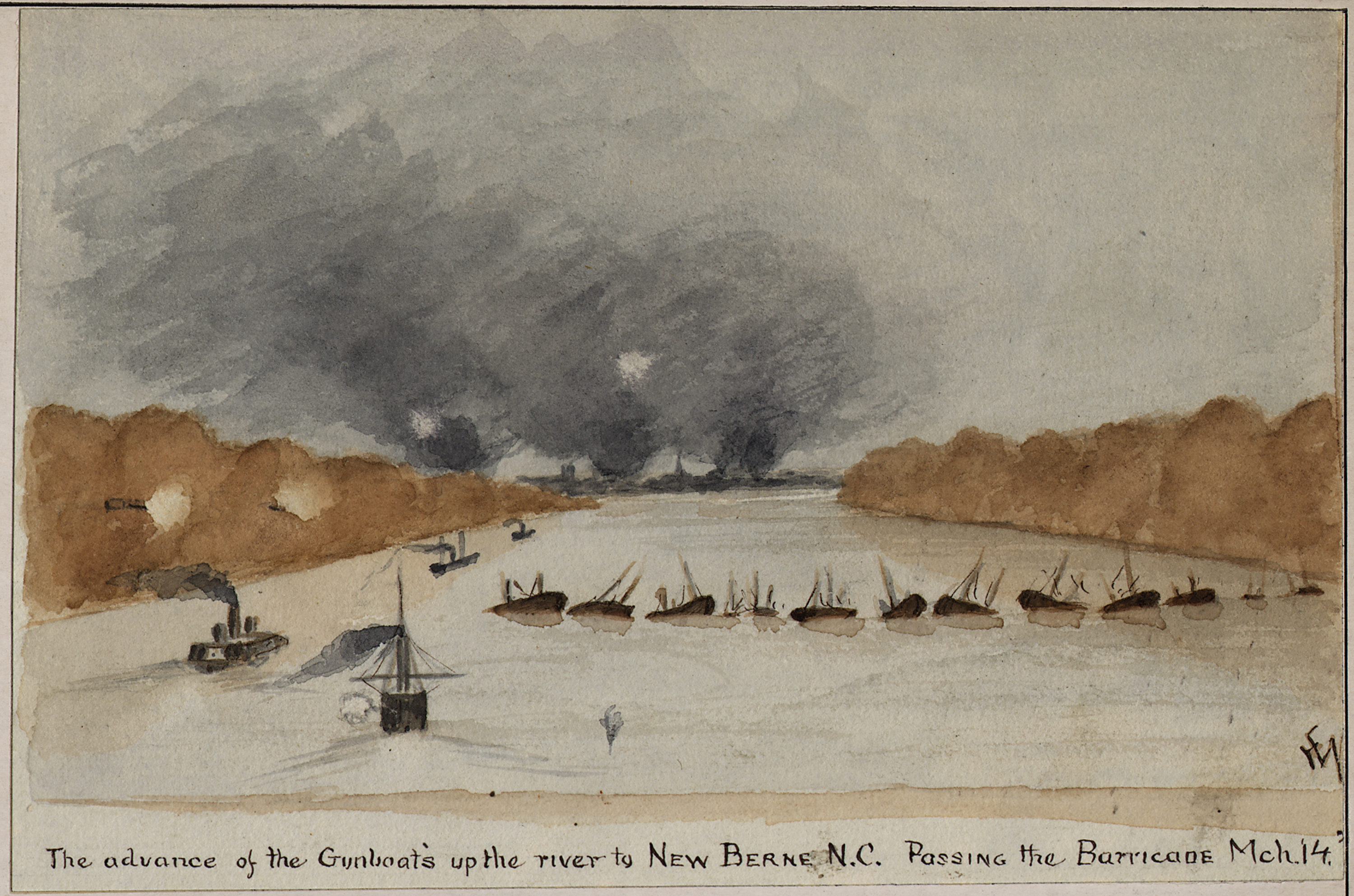 This sketch of advancing gunboats comes from a series of watercolors painted by Herbert Eugene Valentine while serving in the Union Army during the Civil War.