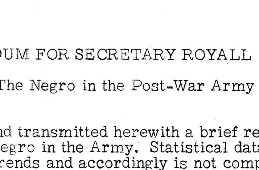 This document comes from the records of the President’s Committee on Equality of Treatment and Opportunity in the Armed Services. The committee was established by Executive Order 9981, on July 26, 1948, to recommend revisions in military regulations in order to implement the Government’s policy of desegregation of the armed services — that there was to be equality of treatment and opportunity for all members of the armed forces, regardless of race, color, religion, or national origin.