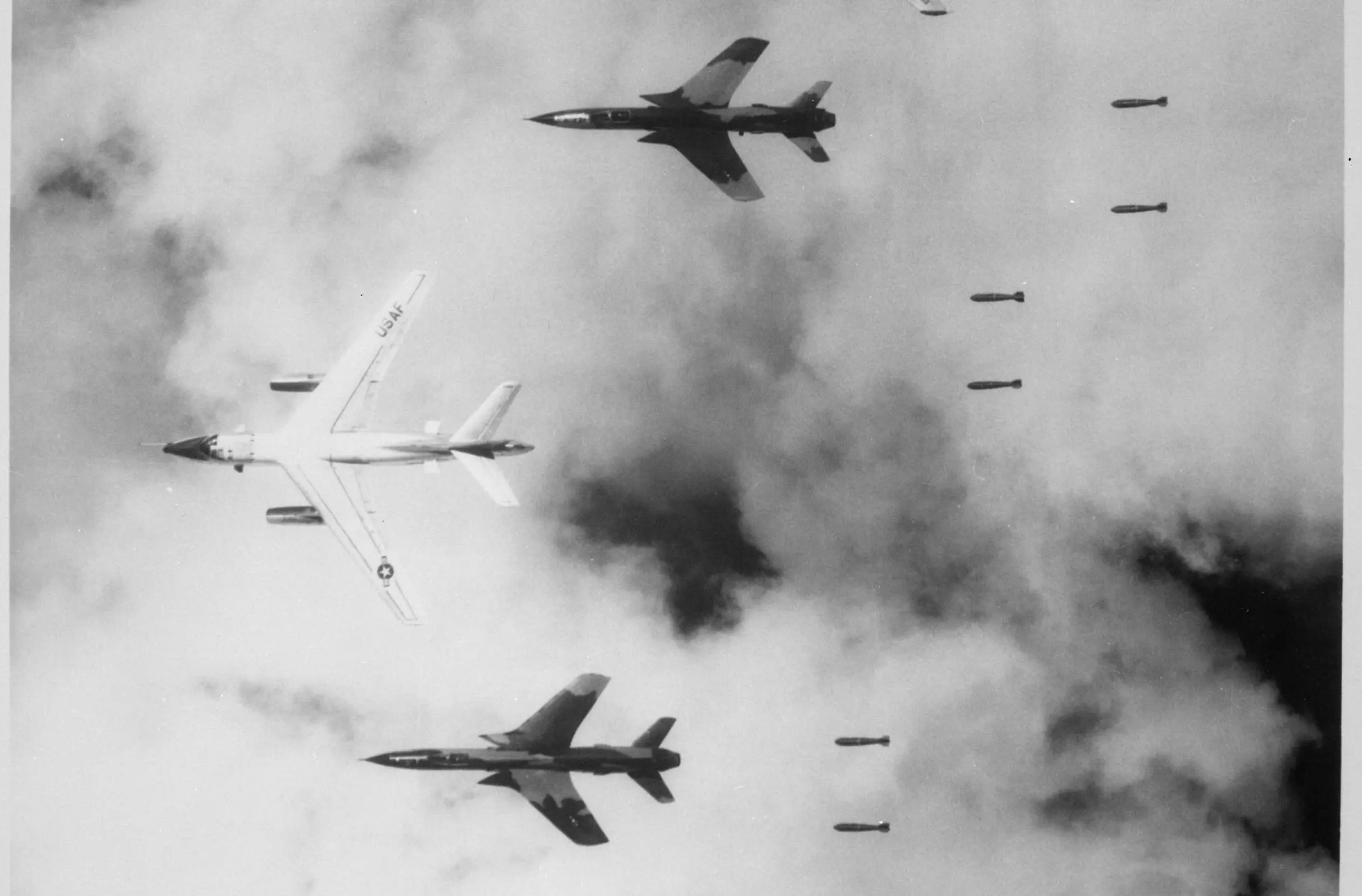 The original caption for this photograph reads: Flying under radar control with a B-66 Destroyer, Air Force F-105 Thunderchief pilots bomb a military target through low clouds over the southern panhandle of North Viet Nam.