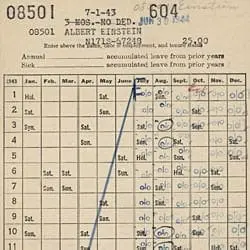 Full Citation: Time Card for Albert Einstein; 7/1/1943-6/30/1944; Official Civilian Personnel Files, 1921–1979; Records of the U.S. Civil Service Commission, Record Group 146; National Archives at St. Louis, St. Louis, MO. [Online Version, https://docsteach.org/document/time-card-for-albert-einstein/, April 3, 2026]