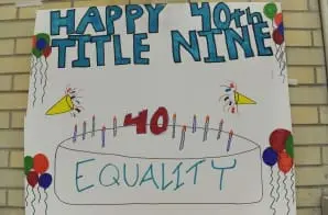 This handmade poster celebrates the 40th anniversary of Title Nine. Title IX, which was included in the Education Amendments Act of 1972, prohibits sex discrimination in education programs supported by Federal dollars. The Act opened doors for young women—especially in athletics. The number of women playing sports in high school and college quintupled by the 1980s.