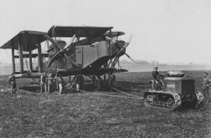 The original caption for this photograph reads: A small motor tractor getting a huge R.A.F. bombing machine into position on an aerodrome 207th Squadron R.A.F. Ligescourt. Somme Campaign.