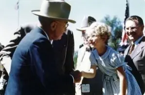 President Harry S. Truman (left), campaigning in Denver, Colorado, shakes hands with a 7-year-old admirer, Susan Smith, who predicted his re-election and spoke of their common interest in the piano. Others are unidentified.