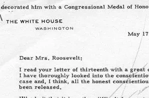 My experience in the first world war with conscientious objectors was not a happy one — the majority of those with whom I came in contact were just plain cowards and shirkers — that is the reason I asked Justice Roberts to make a complete survey of the situation and to release all those that he felt were honestly conscientious objectors and that has been done. My sympathies with the rest of them are not very strong, as you can see. [crossed out text: I do appreciate your interest in them and can see now that all danger is passed why they would want to get out of jail.]