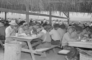 The original caption for this photograph, taken by a War Relocation Authority photographer, reads: Tule Lake Relocation Center, Newell, California. A view in the lunch shed at the farm. Trucks from the kitchens bring hot lunches to the workers.