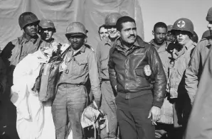 The original caption for this photograph reads: “Members of the 99th Fighter Squadron of the Army Air Forces, famous all-Negro outfit, who are rapidly making themselves feared by enemy pilots, pose for a picture at the Anzio beachhead. In the foreground, head bared, is 1st Lt. Andrew Lane.”