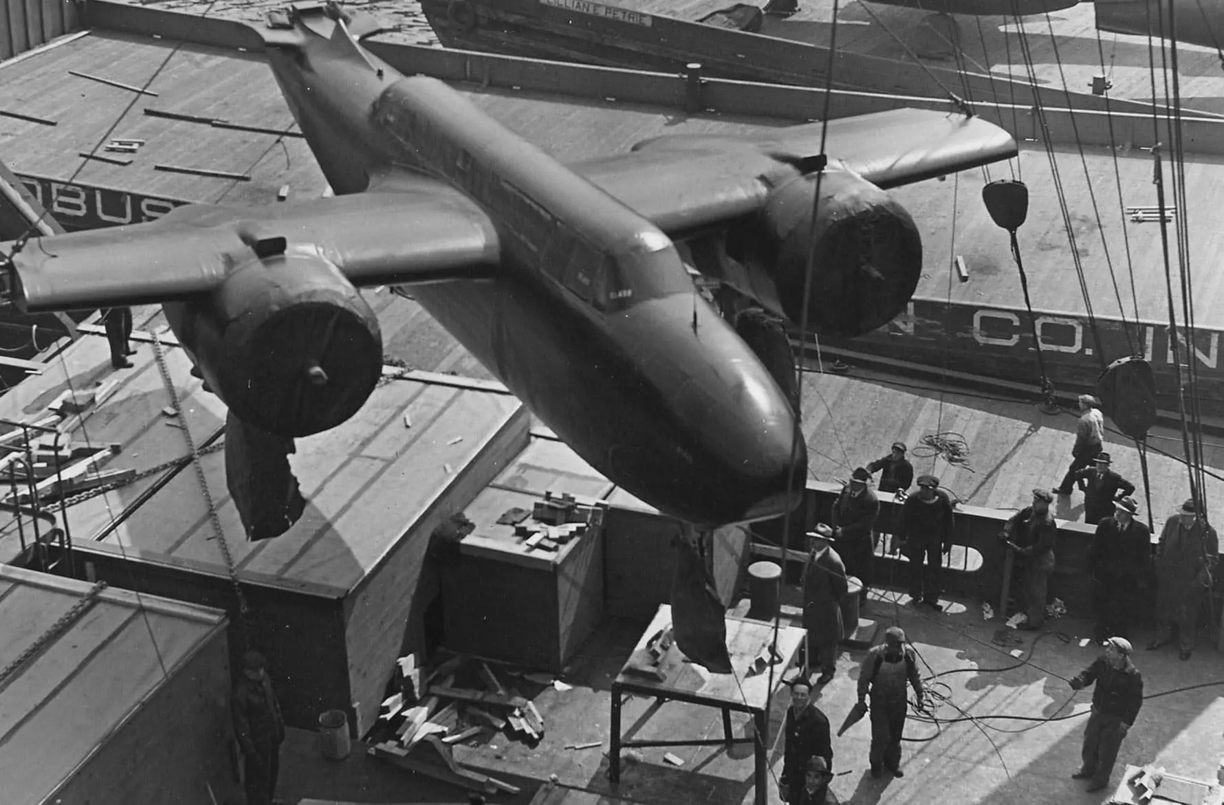 This photograph shows American twin-engine bombers, provided through the Lend-Lease program, being hoisted aboard a ship.