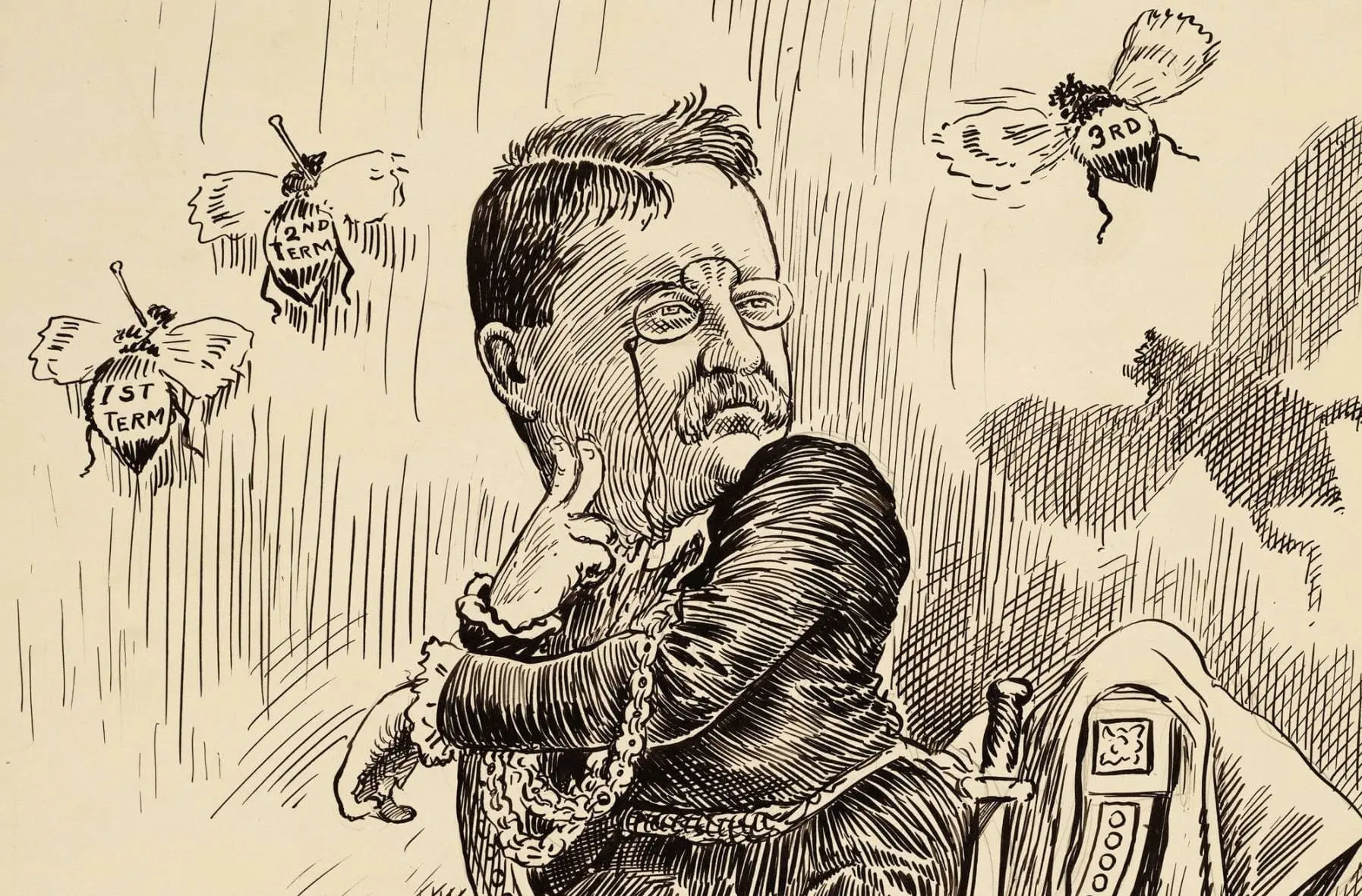 This cartoon depicts President Theodore Roosevelt questioning whether to run for a third term of office. Roosevelt was elected Vice President in 1900. Six months into his term, President William McKinley was assassinated, and Roosevelt ascended to the Presidency. After winning the 1904 election, Roosevelt announced that he would honor the Presidential two-term tradition by retiring in 1909. He proved immensely popular, however, and supporters urged him to run for an unprecedented third term.