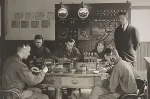 The original caption for this photograph reads: University of California. Section in radio operation, Radio Laboratory of the college of Electrical and Mechanical Engineering. Vocational section of the Student’s Army Training Corps.