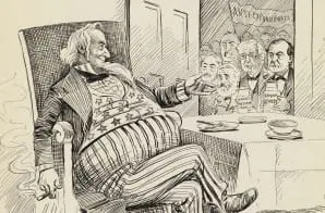 In this cartoon, Uncle Sam’s expanded waistline is symbolic of the rapid pace of U.S. territorial expansion. A treaty adding Hawaii to the United States and victory over Spain brought the U.S. several new territories, including Hawaii, Puerto Rico, Cuba, and the Philippines, all listed on the menu shown in the cartoon.
