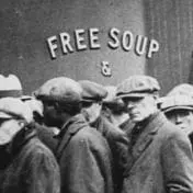 The storefront sign reads “Free Soup, Coffee and Doughnuts for the Unemployed.”