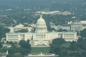 The original caption for this photograph reads: This is an aerial view of the United States Capitol Building, the legislative center of the nation. Location: Washington, District of Columbia (38.890° N 77.014° W). Status: Public domain. Photo by Amy Davis.