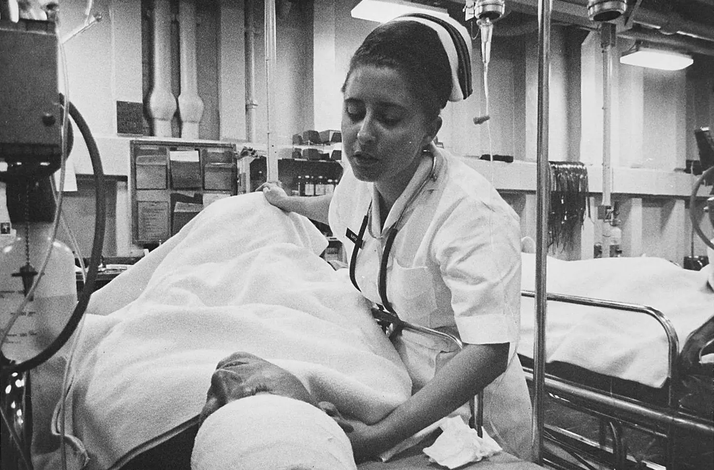 The original caption for this photograph reads: South China Sea….A nurse tends a patient just out of surgery in the intensive care ward of the hospital ship USS Repose (AH-16). The ship is steaming off the coast of Vietnam a few miles south of the 17th parallel.
