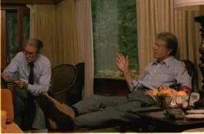 This photograph shows Secretary of State Cyrus Vance and President Jimmy Carter in discussion at Camp David the day after the signing of the Camp David Accords.