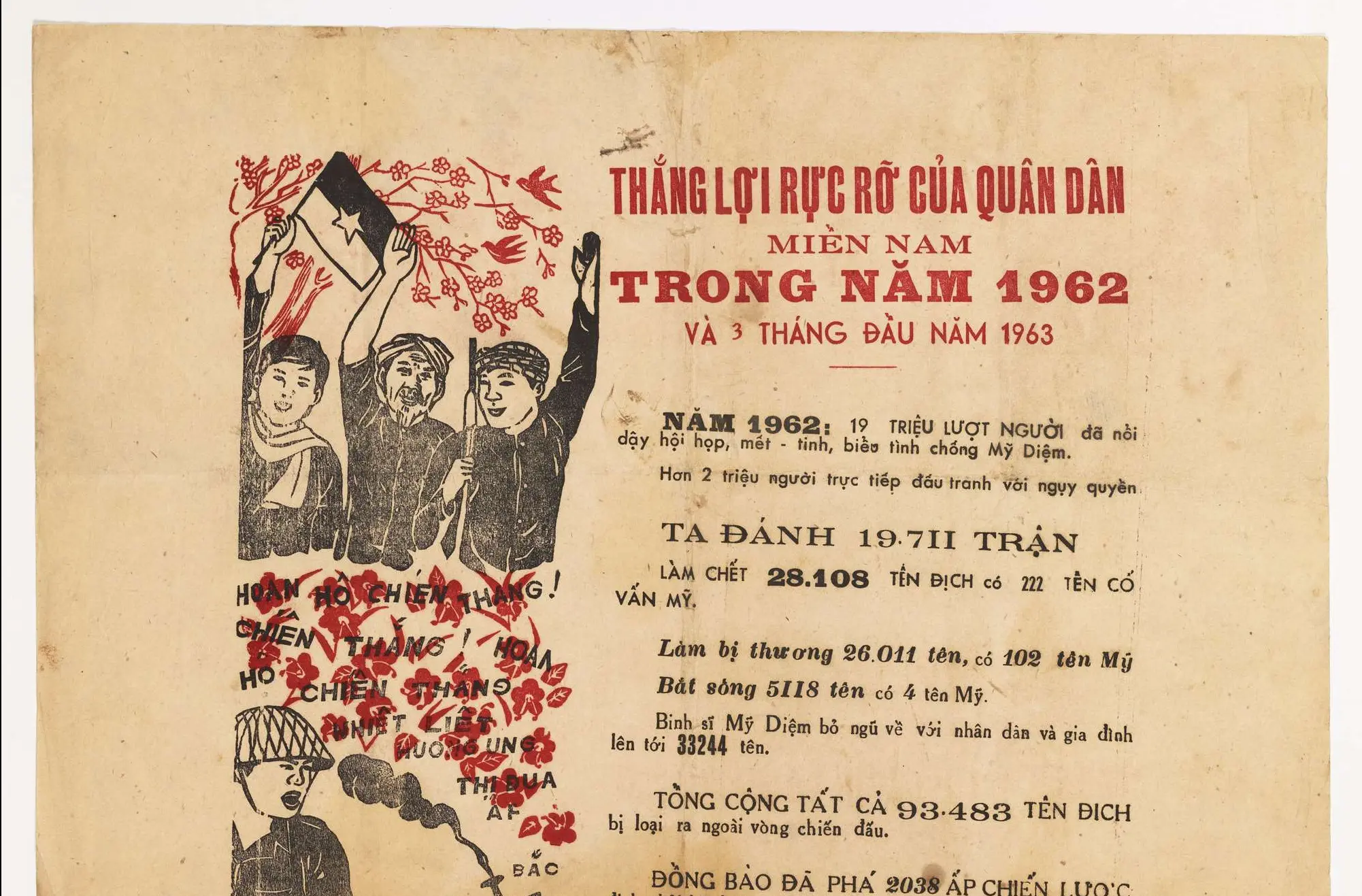 This Communist propaganda poster celebrates army victories in 1962 and the first three months of 1963 with some questionable numbers. Below is a partial translation of the text followed by actual numbers where available.