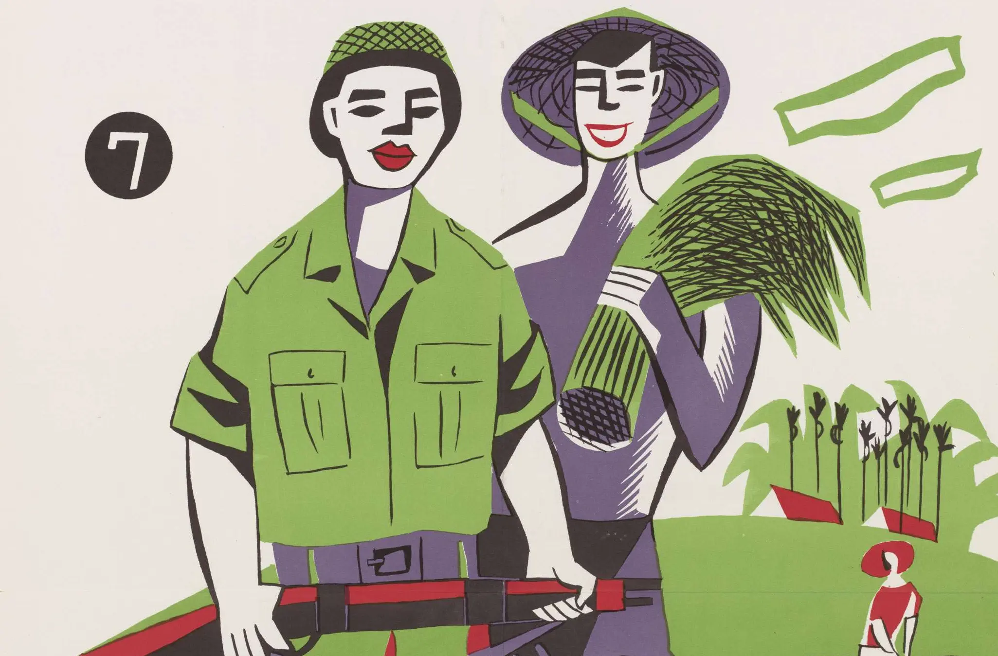 This propaganda poster comes from a series of army behavior posters used during the Vietnam War. It says “You must be close to the people, protect the people and help the people.”