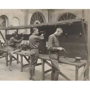 Original Caption: Vocational section of Student Army Training Corps. University of California, Berkeley, California. Member of electrical construction class, wiring return call annunciator in the electrical laboratory of the College of Mechanical and Electrical Engineering.