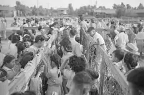 The original caption for this photograph reads: Poston, Arizona. The bus waits outside and young and old are anxious to be off. After the final plans have been made, boxes packed, and grants picked up, the residents of Poston are at last ready to leave the center. Now that so many of their friends have gone out before them, it is with a feeling of anticipation rather than sorrow that the evacuees prepare to leave the place which for three years has been home to them.