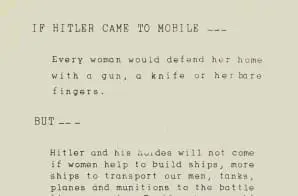 You are needed in the war jobs and in other essential civilian jobs directly aiding the war effort in Mobile NOW. Manpower has been practically exhausted. Housing available at this time will not permit the bringing into Mobile of the thousands of additional workers required for the shipyards and other war and essential industries. We must depend on you – upon womanpower. There are idle machines in war plants which you can operate. There are idle jobs in the shipyards which you can fill. There are jobs in stores, offices, transportation, restaurants, hospitals in which you can render essential war service.