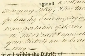 This warrant orders the marshal and deputies of the Massachusetts district to arrest and take into custody the ship Charming Sally and her appurtenances (equipment and cargo). It notes that a libel was filed by Isaac Sherman of Boston. A libel is an accusation brought against someone or something claiming property ought to be seized, in this case the ship and its cargo for “transportation of slaves contrary to law.”