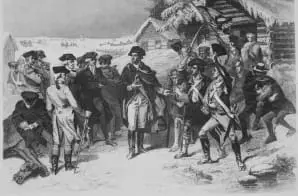 This is a copy of an engraving based on a painting by W.H. Powell. It was gathered as part of the George Washington Bicentennial Commission. The Commission’s purpose was to celebrate the birth and accomplishments of Washington, and to collect, preserve, and publish writings, artworks, and photographs pertinent to his life and times. The National Archives holds this photograph (from 1931-1932) of the print as part of the records of the Commission.