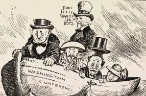 The boat in the cartoon bears the name of the conference and carries five figures representing the five treaty powers: Great Britain, Japan, France, Italy, and the United States. While four nations peer fearfully at the “submarine issue,” Uncle Sam faces forward confidently saying, “Don’t let it frighten us boys.” The depiction of Uncle Sam as leading the negotiations reflects America’s prominent role in post-war world affairs.