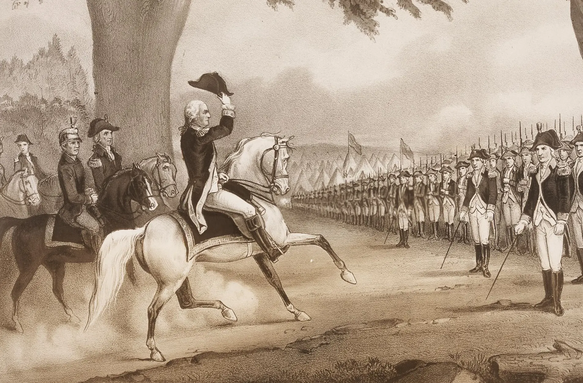 This copy of an 1876 Currier & Ives lithograph shows General George Washington taking command of the American Army at Cambridge, Massachusetts, on July 3, 1775. The image was collected as part of the George Washington Bicentennial Commission’s plans for a celebration of the birth and accomplishments of the nation’s first President.