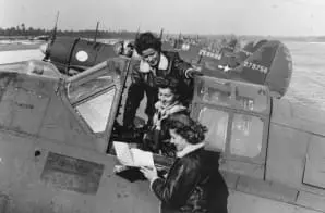 The original caption for this photograph reads: “WASPs around a Curtis A-25A making last minute check-up before taking off, Army Air Field, Camp Davis, North Carolina.”