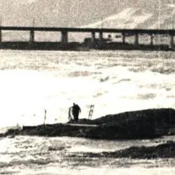 This black and white photograph shows a wide view looking downstream at fishermen around Celilo Falls, Oregon, with the Celilo Bridge, also known as the Oregon Trunk Railroad Bridge, in the background. This document was digitized by teachers in our Primarily Teaching 2015 Summer Workshop in Seattle.